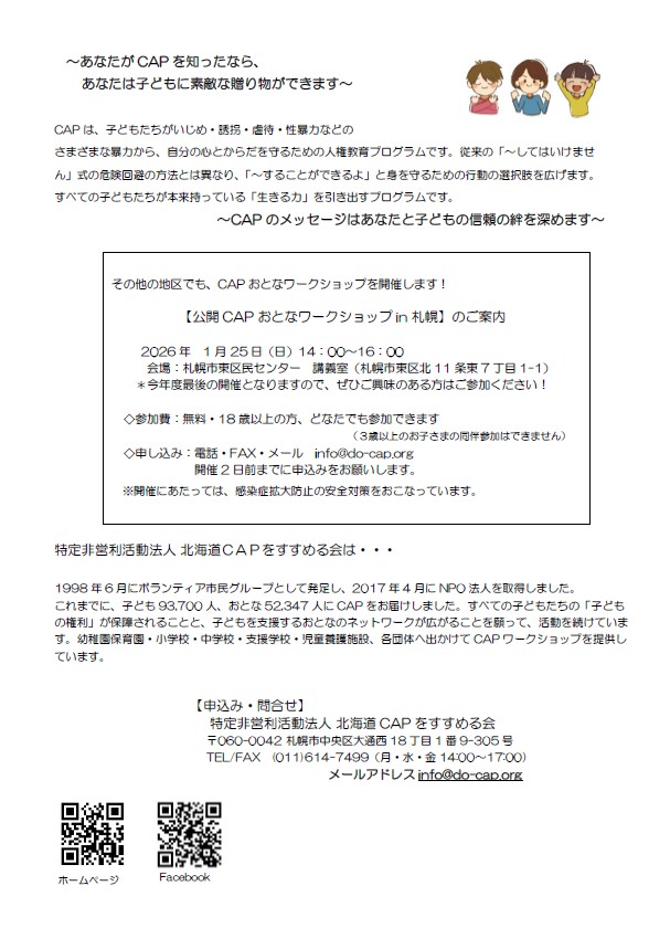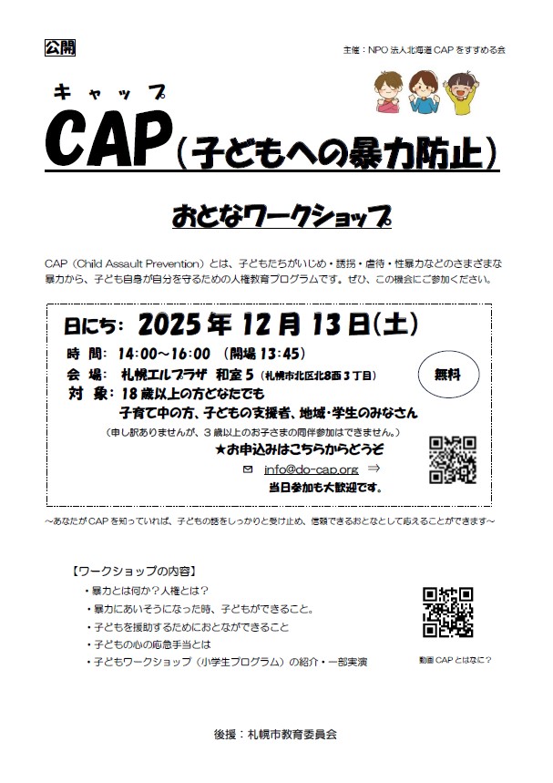 2025年度、北海道CAPをすすめる会は札幌市内5か所での公開CAPおとなワークショップを開催します。